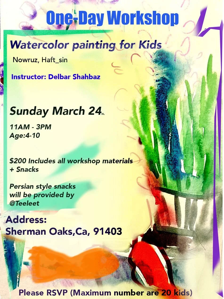 Since Nowruz is close, this one day workshop is an excellent opportunity to appreciate this ancient celebration of the spring. Let's remember the beginning of this spring by painting elements of Haft-Sin*. The workshop is on Sunday, March 24, from 11 am to 3 pm. Kids' range for participation is between 4 and 10 years old.